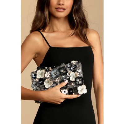 Blossom With Style Grey Velvet Multi Floral Sequin Beaded Clutch